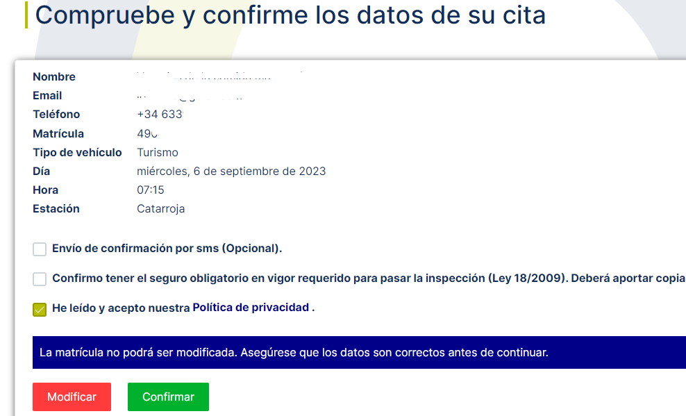 Confirma que los datos son correctos y haz click en el botón de confirmar. Una vez hecho esto, ya tendrás hecha la reserva. El pago se efectuará en la misma ITV. Recuerda llegar con antelación a la ITV de Ribarroja.